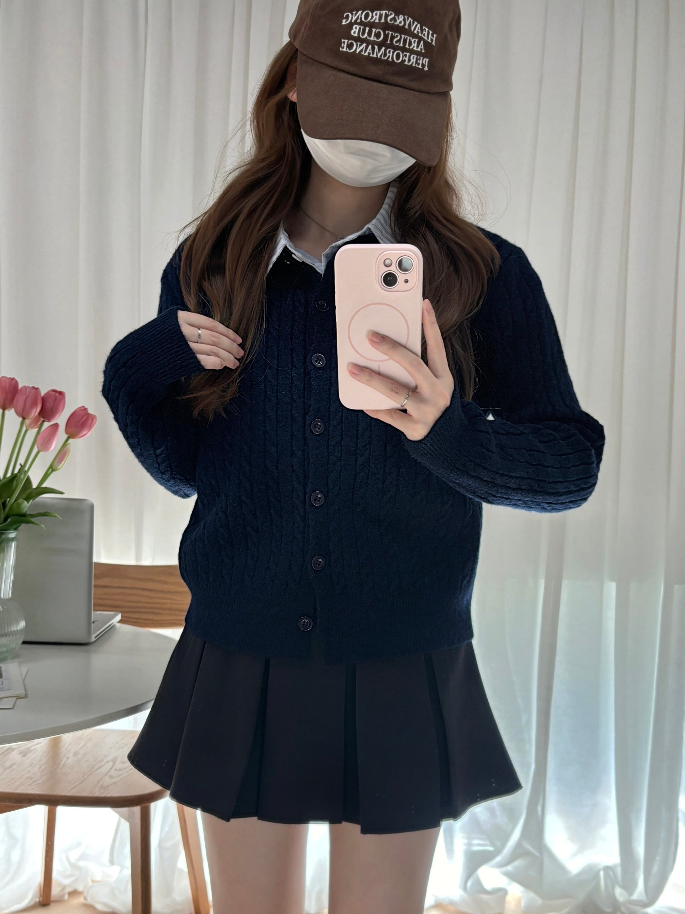 定番のケーブル編みデザインで、トラッドな雰囲気漂うカーディガン。