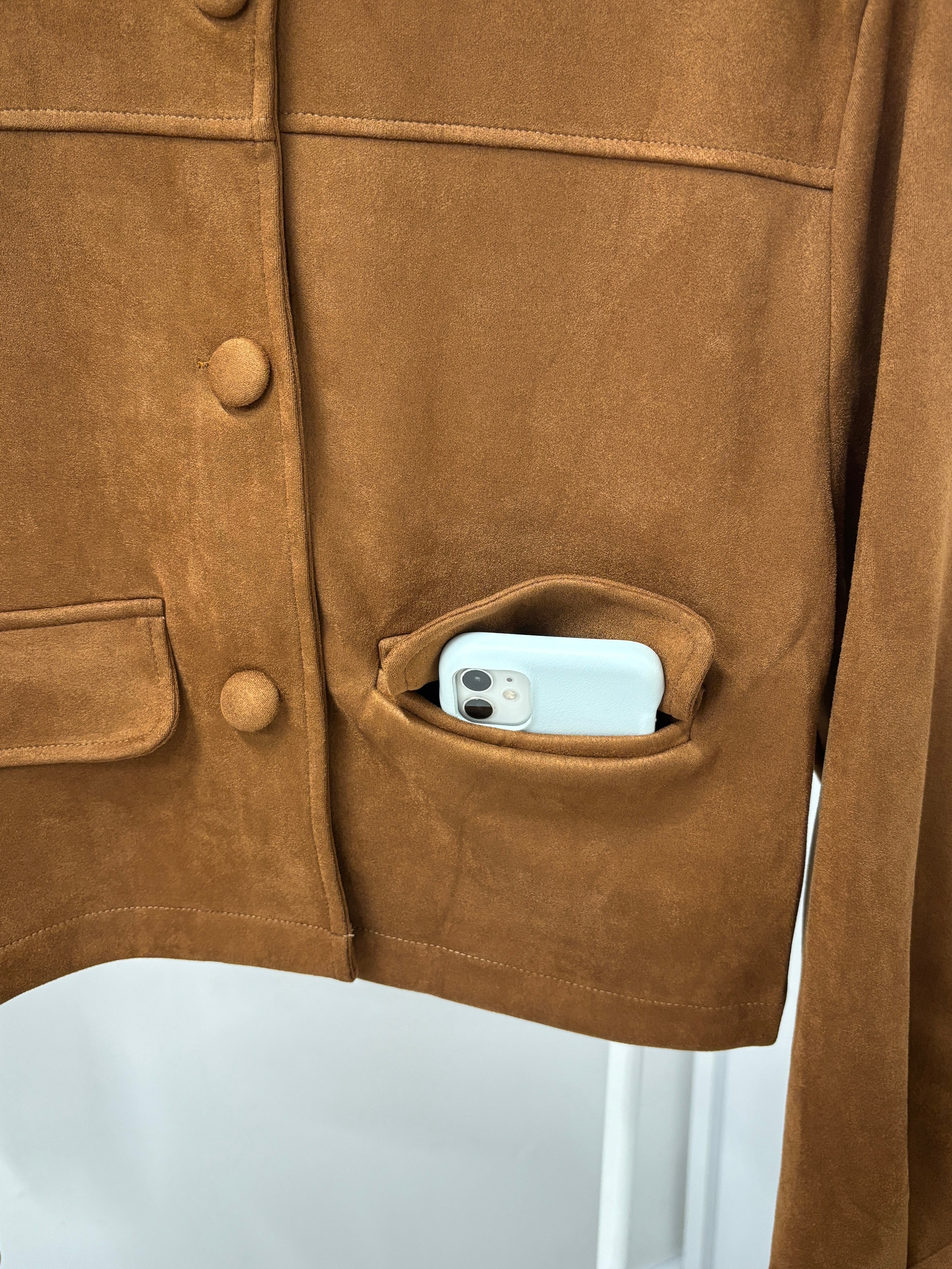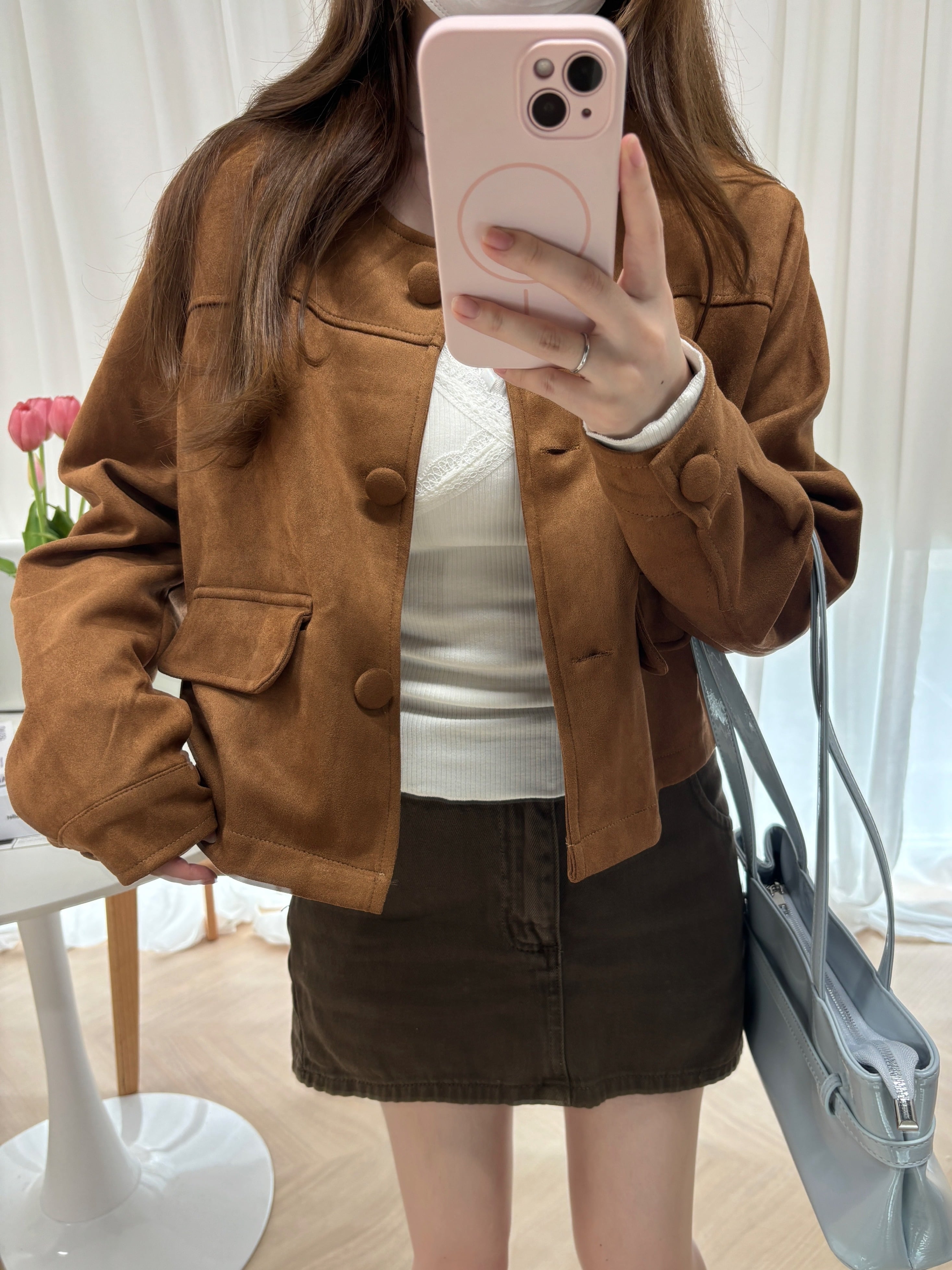 スエードタッチの柔らかな素材感で、羽織るだけで上品な雰囲気を演出します。